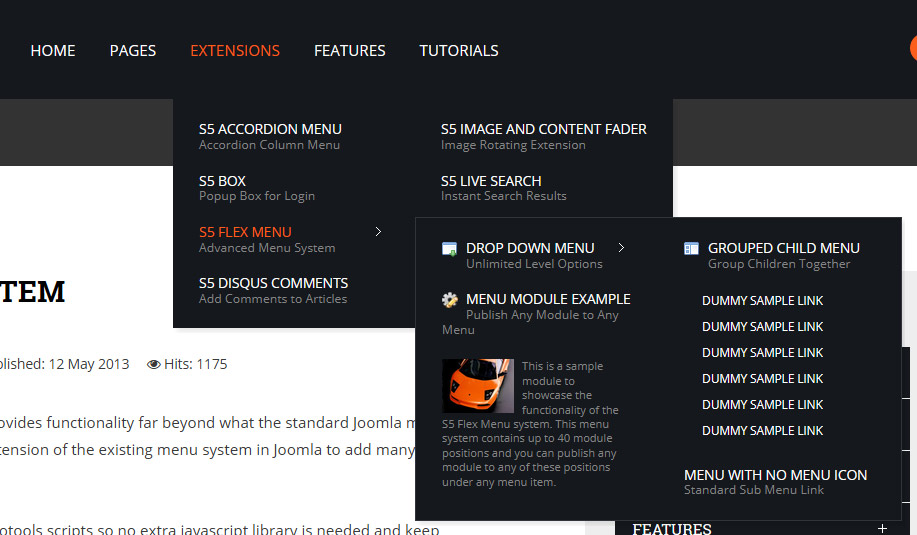 The S5 Flex Menu system is a very powerful plugin that provides functionality far beyond what the standard Joomla menu system can provide. This plugin is intended to be as an extension of the existing menu system in Joomla to add many new features! Please see the full list of features below.